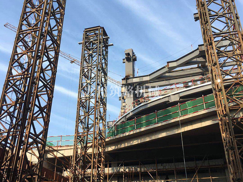 基本情況:部分構(gòu)件工廠組裝好,分片運輸至現(xiàn)場。采用4片321型貝雷片組合而成的貝雷方柱作為大跨度鋼桁架下部的臨時支撐胎架,待上部鋼桁架安裝完成后分級卸載,最后分片拆除。拆卸后鋼桁架撓度符合要求。貝雷方柱支撐胎架高度達(dá)20m,支撐荷載約50t。